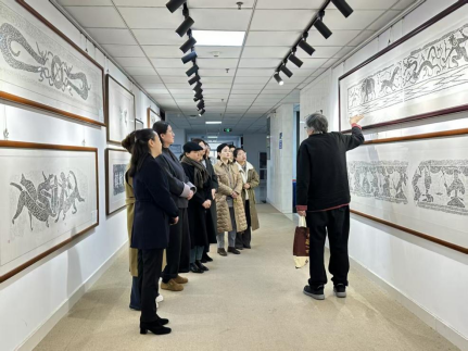 魏崇周代表学院对来访人员表示欢迎,简要介绍了学院的基本情况,重点介绍了我院的实验室建设及非物质文化遗产的教学、研究、实践体系。随后,在非遗传承人方清刚的引导下,来宾参观了汉画走廊、河南省非物质文化遗产传习实训中心、文化创意综合实验室等一系列实验场所,对非物质文化遗产技艺有了更深入地了解。在实践体验环节,方清刚老师现场示范拓印技术,指导大家完成以“龙”“凤”等为主题的拓片。通过亲手操作,来访人员深刻体悟到非遗技艺所承载的文化底蕴,为后续推动非遗文化进校园、进课堂筑牢了情感基础。