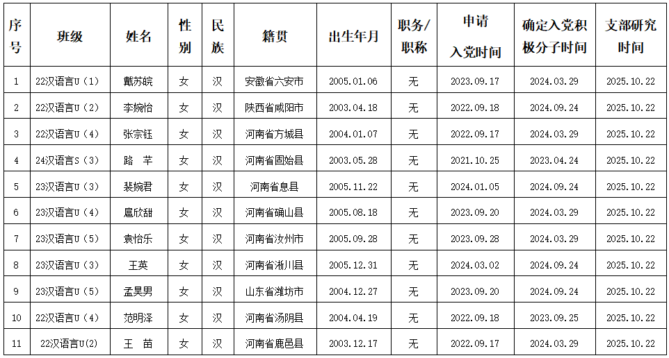 综合民主评议结果和培养人、群众、党员意见,经支部大会讨论研究和党总支预审,拟确定戴苏皖等11名同志为党员发展对象。根据发展党员工作有关要求,现将有关情况公示如下: